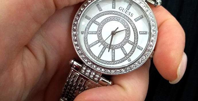 Безель часов усыпан кристаллами.